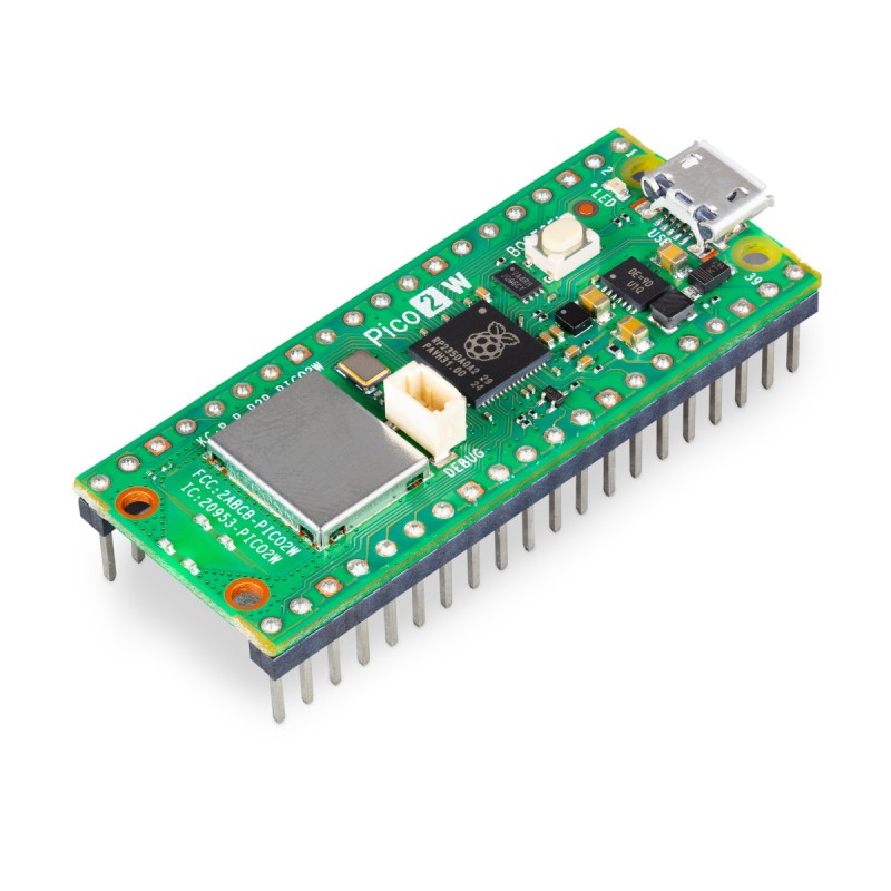 Raspberry Pi Pico 2WH, oparty na mikrokontrolerze RP2350 i ma wbudowany moduł komunikacji WiFi i Bluetooth. Pi Pico 2WH oferuje znacznie zwiększoną wydajność i funkcjonalność dzięki zastosowaniu rdzeni Cortex M33 i RISC-V, podwojonej pamięci SRAM oraz zaawansowanym funkcjom bezpieczeństwa, w tym Arm TrustZone. Jest kompatybilny sprzętowo i programowo z poprzednim modelam, co czyni go atrakcyjnym wyborem dla entuzjastów i profesjonalistów w dziedzinie systemów wbudowanych. Wersja z wlutowanymi złączami.