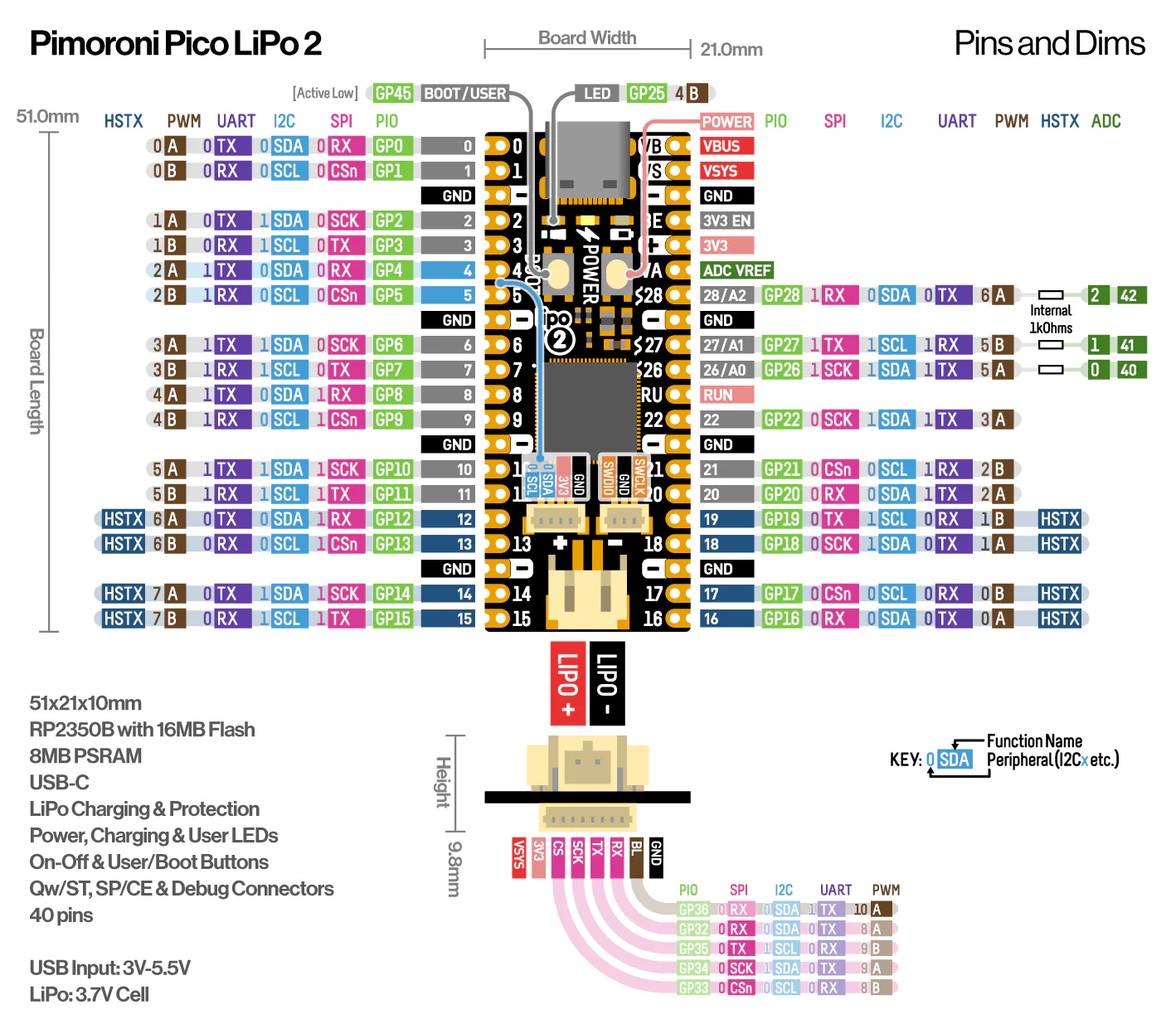 Rozbudowana płytka rozwojowa z mikrokontrolerem RP2350B, 16 MB pamięci flash QSPI oraz 8 MB pamięci PSRAM, zaprojektowana z myślą o projektach wymagających większych zasobów oraz zintegrowanego zarządzania zasilaniem bateryjnym. Płytka wyposażona w ładowarkę LiPo/Li-Ion MCP73831 z prądem ładowania 215 mA, zabezpieczenie akumulatora XB6096I2S oraz złącze JST PH 2-pin do bezpośredniego podłączenia akumulatora. Diody LED sygnalizują stan zasilania i ładowania, a przyciski POWER i BOOT umożliwiają kontrolę zasilania oraz pełnią funkcje użytkowe.