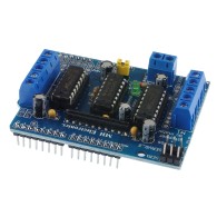 Moduł zawiera dwa sterowniki silników L293D oraz rejestr przesuwny 74HC595. Rejestr przesuwny rozszerza 3 linie Arduino do 8 linii, co pozwala na sterowanie kierunkiem pracy silników. Wyjście L293D jest bezpośrednio sterowane wyjściami PWM Arduino