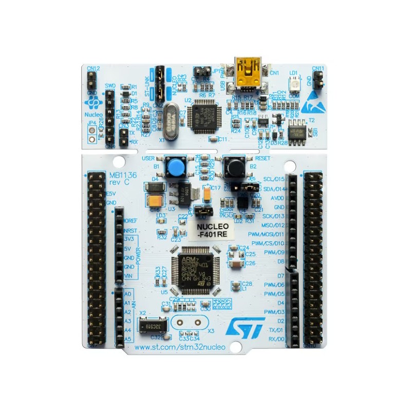 Zestaw startowy z serii NUCLEO wyposażony w mikrokontroler STM32F401RE (256 kB Flash, Cortex-M4), z wbudowanym programatorem-debugerem ST-Link/v2, wyposażony w złącza zgodne z Arduino.
