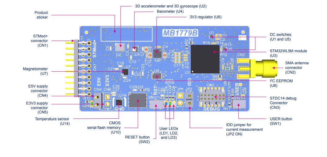 Na pokładzie płytki znajduje się zestaw czujników MEMS, obejmujący czujnik temperatury, magnetometr 3-osiowy, akcelerometr, żyroskop oraz czujnik ciśnienia, co umożliwia szybkie tworzenie kompletnych prototypów urządzeń pomiarowych i środowiskowych. Płytka wyposażona jest w diody LED użytkownika, przyciski oraz złącza STMod+ i MIPI Debug. Programowanie i debugowanie realizowane jest za pomocą zewnętrznego debuggera, np. STLINK-V3SET. Zasilanie możliwe jest z zewnętrznych źródeł lub poprzez USB Type-C dostępne na opcjonalnej płytce adaptera STMod+ .