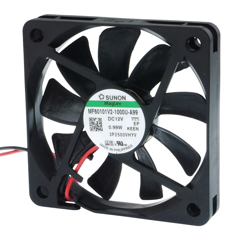 Wentylator SUNON o wymiarach 60x60x10 mm zapewnia efektywne chłodzenie i niski poziom hałasu, idealny do zastosowań w kompaktowych urządzeniach elektronicznych, oferując niezawodność i bezpieczeństwo dzięki funkcji autorestartu i solidnym materiałom. Sunon MF60101V2-1000U-A99