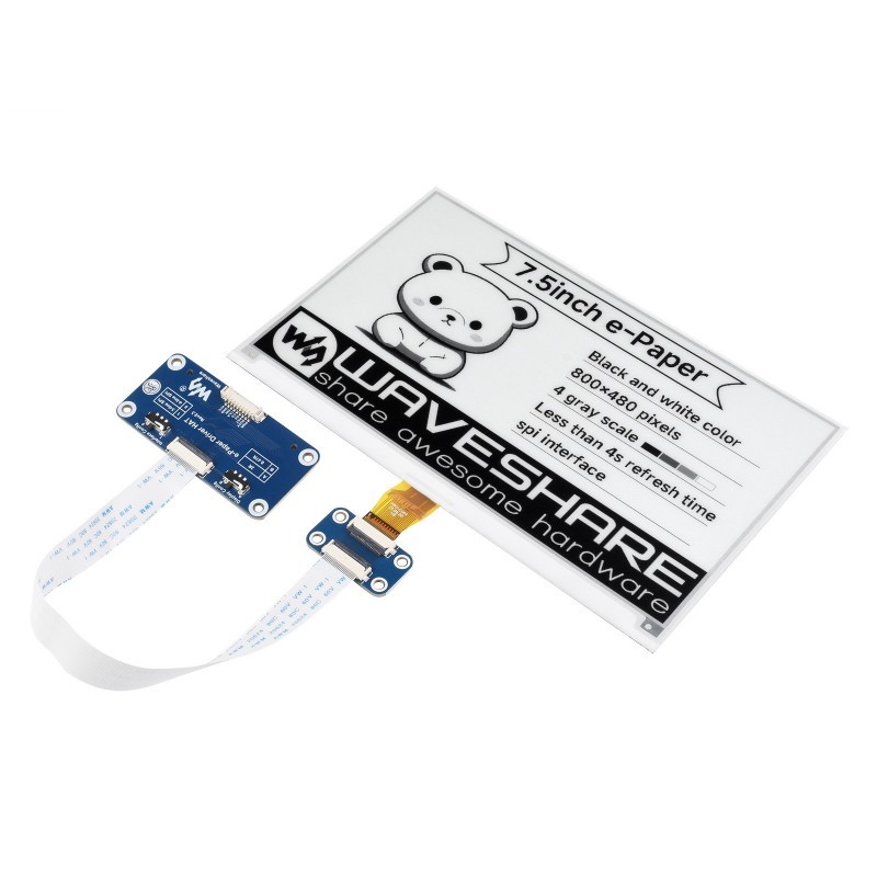 Moduł z wyświetlaczem e-Paper o przekątnej 7,5" i rozdzielczości 800×480 px. Ma możliwość wyświetlania treści z czterostopniową skalą szarości oraz funkcję częściowego odświeżania. Wbudowany kontroler realizuje komunikację za pomocą interfejsu SPI. Wyświetlacze tego typu cechują się wysokim kontrastem wyświetlanego obrazu i pobierają prąd tylko w przypadku zmiany wyświetlanej treści. Moduł ma wbudowany konwerter poziomów napięcia dzięki czemu jest kompatybilny z systemami 3,3 V oraz 5 V. Do zestawu dołączona jest nakładka pozwalająca na podłączenie wyświetlacza przez złącze 40-pinowe. Na stronie Wiki dostępne jest wsparcie w postaci przykładów użycia z Raspberry Pi, Jetson Nano, Arduino, STM32.