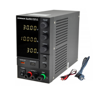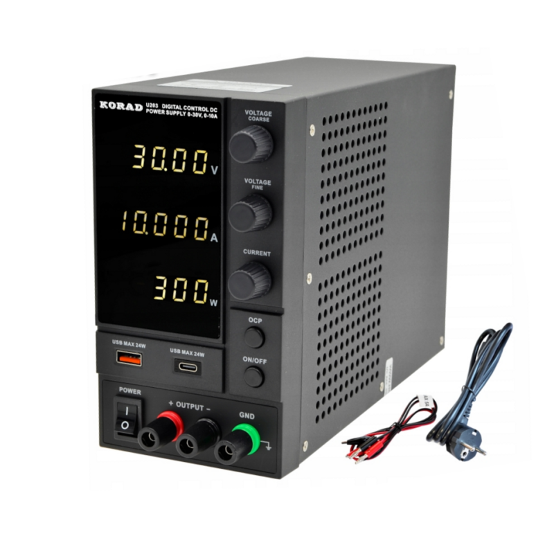 Stabilizowany zasilacz laboratoryjny przeznaczony do zastosowań serwisowych, przemysłowych i edukacyjnych, umożliwiający precyzyjną regulację napięcia w zakresie od 0 do 30 V oraz natężenia prądu do 10 A. Urządzenie wyposażone jest w dwa porty USB (typ A i typ C) o maksymalnej mocy pojedynczego portu 24 W, umożliwiające szybkie ładowanie urządzeń mobilnych. Wyraźny wyświetlacz LED prezentuje napięcie, prąd oraz moc z wysoką dokładnością, a funkcja zapamiętywania ostatnich ustawień ułatwia codzienną pracę. Obsługa trybów CV, CC, OCP i OTP pozwala na szeroki zakres zastosowań w laboratoriach, warsztatach i instytucjach edukacyjnych.