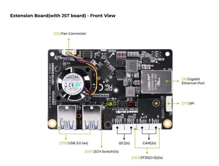Płytka rozszerzeń reComputer Mini Extension Board przeznaczona do współpracy z płytą główną reComputer Mini Carrier Board zapewnia dodatkowe interfejsy komunikacyjne wykorzystywane w systemach autonomicznych, takich jak drony, roboty patrolowe czy pojazdy dostawcze. Moduł montowany od spodu płyty głównej rozszerza funkcjonalność o port Gigabit Ethernet, cztery złącza USB 3.0, podwójny interfejs CAN, magistrale I²C oraz SPI. Konstrukcja obsługuje zasilanie do 54 V, co umożliwia integrację w systemach bateryjnych 48 V. Kompaktowe wymiary i możliwość montażu biurkowego lub ściennego czynią płytkę elastycznym rozwiązaniem do rozbudowy systemów AI opartych na platformach Jetson Orin Nano i Orin NX.