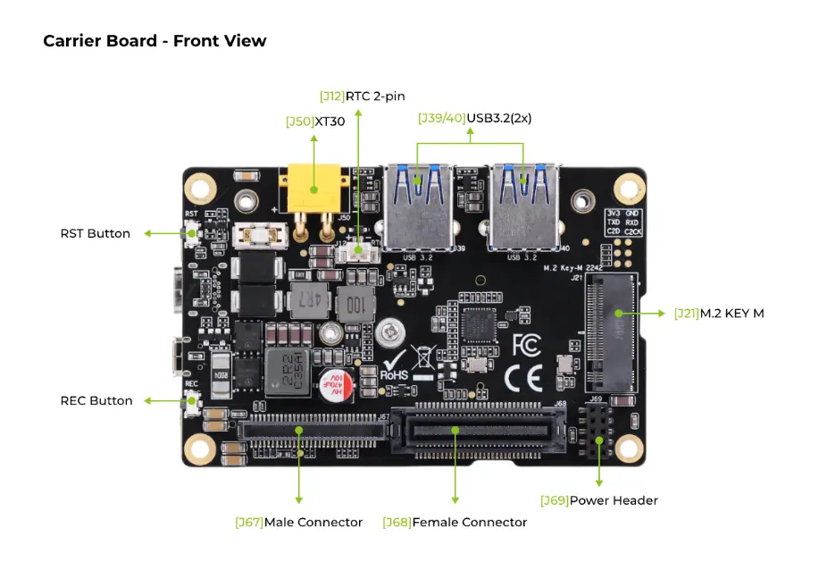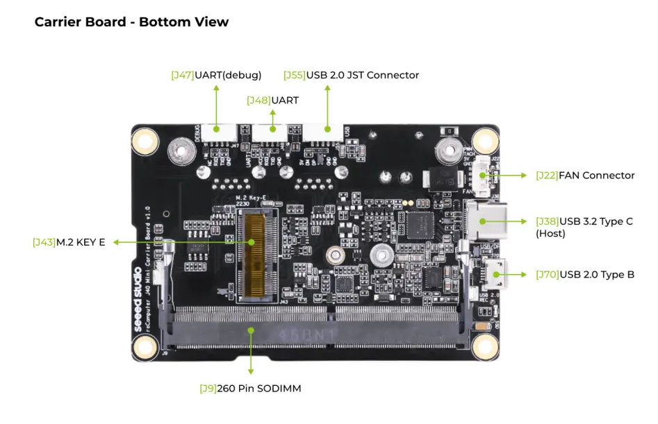 Płyta główna reComputer Mini Carrier Board o wadze 80 g została zaprojektowana do zastosowań mobilnych i autonomicznych w UAV oraz UGV, zapewniając pełną kompatybilność z modułami NVIDIA Jetson Orin Nano i Orin NX. Umożliwia obsługę wielu czujników – od kamer RGB i podczerwieni po LiDAR i kamery 3D – wspierając nawigację, unikanie przeszkód i detekcję obiektów w czasie rzeczywistym. Wyposażona w interfejsy UART, Ethernet i CAN (przy użyciu płytki rozszerzeń) umożliwia bezpośrednie połączenie z kontrolerami lotu i peryferiami. Obsługa szerokiego zakresu napięć zasilania (4S–14S, XT30 DC-IN, do 54 V) czyni ją szczególnie przydatną w systemach bateryjnych. Dzięki gniazdom M.2 możliwa jest rozbudowa o SSD NVMe oraz moduły Wi-Fi/Bluetooth, a także podłączenie zewnętrznego modemu 4G/5G dla transmisji obrazu i danych w czasie rzeczywistym.